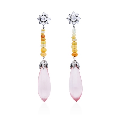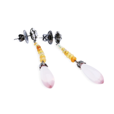 粉紅色或桃紅色石英稱為玫瑰石英或粉晶,其色澤是由於含有少量鈦的緣故。晶體極為稀有,粉晶帶有與眾不同的淡粉色,象徵平和、和諧。浪漫的串珠粉晶耳環,用低調的烏黑金鑲成一朵精巧的小花,呈現出低調甜美的元素,佩戴起來,讓人增添一種優雅的情懷。