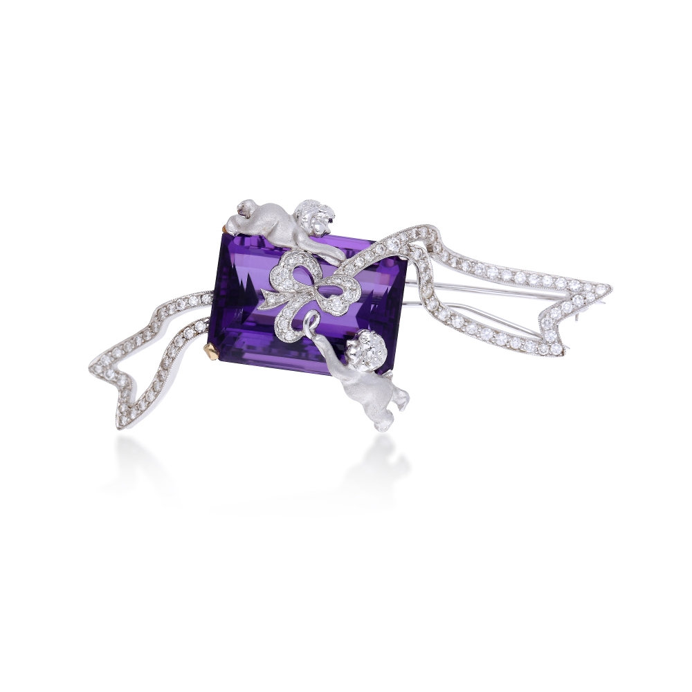 紫水晶amethyst也稱作紫石英,是水晶的一種紫羅蘭色變體,通常用作寶石。紫水晶的主要成分是二氧化矽,硬度7,比重2.65,折射率1.54-1.55,具二向色性。從不同角度觀賞,可顯示出藍或紅的紫色調,天然產出的紫水晶因含鐵、錳等礦物質而形成漂亮的紫色,紫水晶的主色調可以為淺紫羅蘭色至深紫色。它有可能顯示紅色和藍色中的一種或兩種副色調。具有寶石價值的紫水晶均產在火山岩、偉晶岩、或灰岩、葉岩的晶洞中。紫水晶在自然界分佈廣泛,主要產地有巴西、俄羅斯、南非、馬達加斯加。理想品質的紫水晶被稱作Deep Siberian,其具有75-80%的紫色主色調和15-20%的藍色,天然紫水晶具有紫紅色和藍紫色的二色性。紫水晶在西方國家代表著愛的守護石,能賦予情侶、夫妻間深厚之愛、貞節、誠實及勇氣。代表靈性、精神、高層次的愛意,可作對仰慕者的一種定情物、信物。在古代,紫水晶象徵著權力地位,大量的使用在宗教儀式上,被認為能夠驅除邪惡。而紫色在光譜上頻率最高,能量也較強,紫水晶也被稱為清醒之石,代表著智慧,有助幫助頭腦清晰思考與提升精神層次。這款紫水晶珠寶墜,上面討喜的天使設計,滿懷著愛的祝福與喜悅,優雅的白鑽蝴蝶結緞帶環繞著紫水晶,古典且獨一無二的設計,非常適合贈禮給重要對象或給自己一個充滿愛及祝福的禮物。