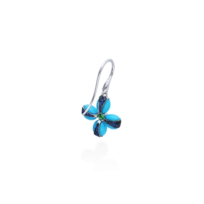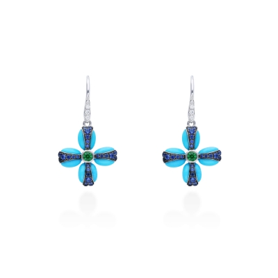 綠松石英文名為Turquoise,綠松石因其碧藍的顏色,被視為碧海藍天的精靈,又稱土耳其石。且綠松石是古老寶石之一,有著幾千年的燦爛歷史,深受古今中外人士的喜歡。鑽石垂墜而下勾勒出以四片花瓣組成的立體小巧之花卉,將其化為永恆停留於耳墜之中。