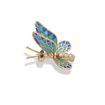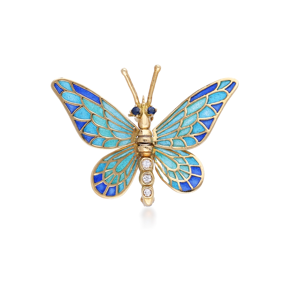 此件琺瑯蝴蝶胸針運用絢麗的琺瑯色彩,富透明的質感,充滿了靈逸和生動,再搭配上藍寶石及鑽石的鮮明層次,從春天到夏天,美麗的蝴蝶翩翩起舞,追逐花朵,彷彿燦爛仙子般穿梭於花圃之間,演繹著獨有的美麗,推薦給您。