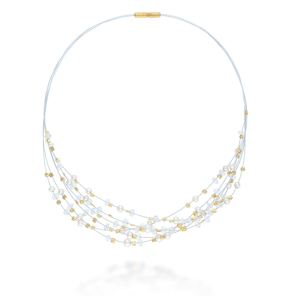 海水藍寶為綠柱石家族之一,內含鐵離子,以海水藍稱之色彩,傳說古時候的水手們相信,美人魚的魚形下身是由海水藍寶製成,認為它可以保護航程的安全,並得到魚獲的豐收,搭配優雅珍珠點綴,更為生動加分。 這條珍珠長鏈是朝著年輕活潑,不論是正式場合或是輕鬆時刻,它都是信手拈來最不可缺的一樣珠寶。